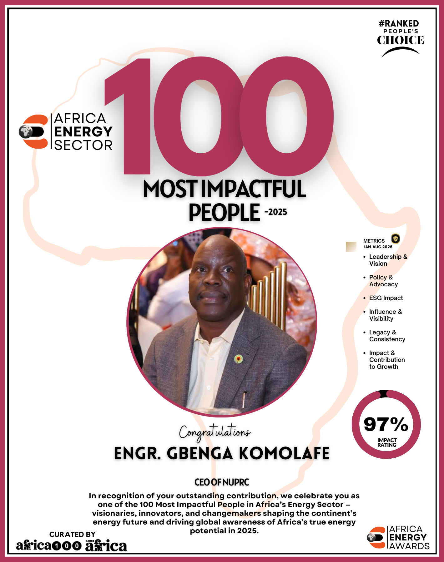 As Ranks Africa unveils this inaugural edition of The Energy 100, we celebrate not just success stories but impact stories — stories of people building Africa’s energy future with integrity, innovation, and purpose.